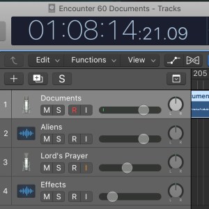 Once all of this is set, I record the documents using Logic Pro X and whatever sound effects I think are useful but not too intrusive. Each document is saved as a wav file named to match the insert notes as seen in the script sample above. I used to record straight through, moving from narration to documents and back, but I’ve found that doing all the documents at once was easier than switching my tone of voice constantly.